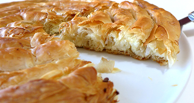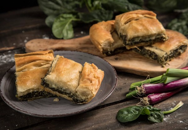 Comunemente conosciuta come “sfogliata di formaggio e spinaci”, questo delizioso tortino è fatto con uova, cipolle, formaggio, e pasta fillo croccante. Si presenta spesso come un grande tortino servito a fette oppure puoi comprare le sfogliatine individuali, che sono anche un ottimo spuntino. Se gli spinaci non sono disponibili, vengono sostituiti con altre verdura a foglia verde, chiamate in genere horta.